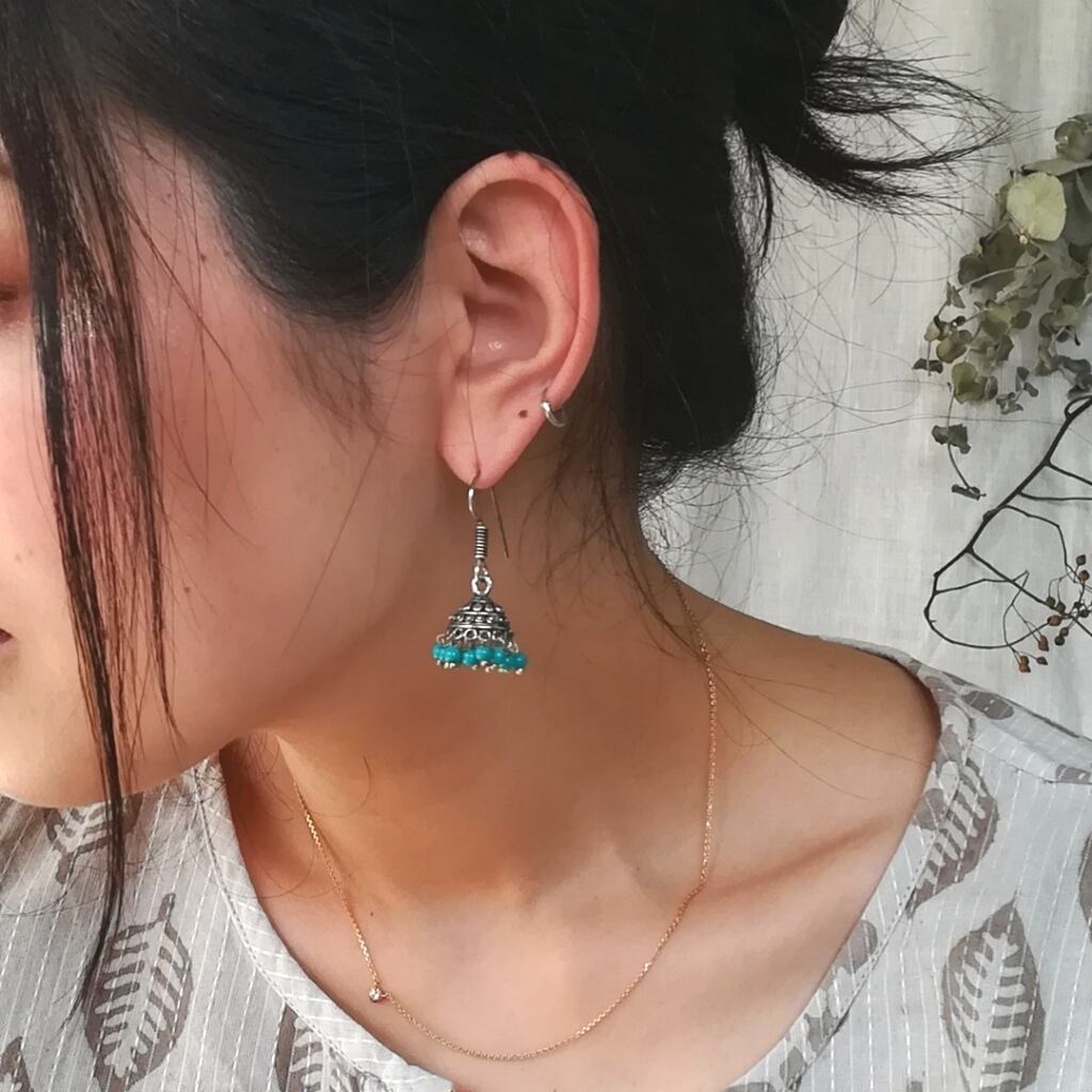 インドではさらに大きくカラフルでゴージャスなものが好まれますが、こちらはとっても小ぶりで軽くアンティーク加工を施しキラキラしすぎず、さりげなく着けやすいジュムカ。