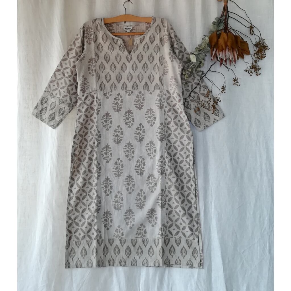 ベージュ×ブラウンのアースカラーの着やすい色彩、パターン違いの切り替え、浮き上がった葉っぱや模様が可愛いクルタです。