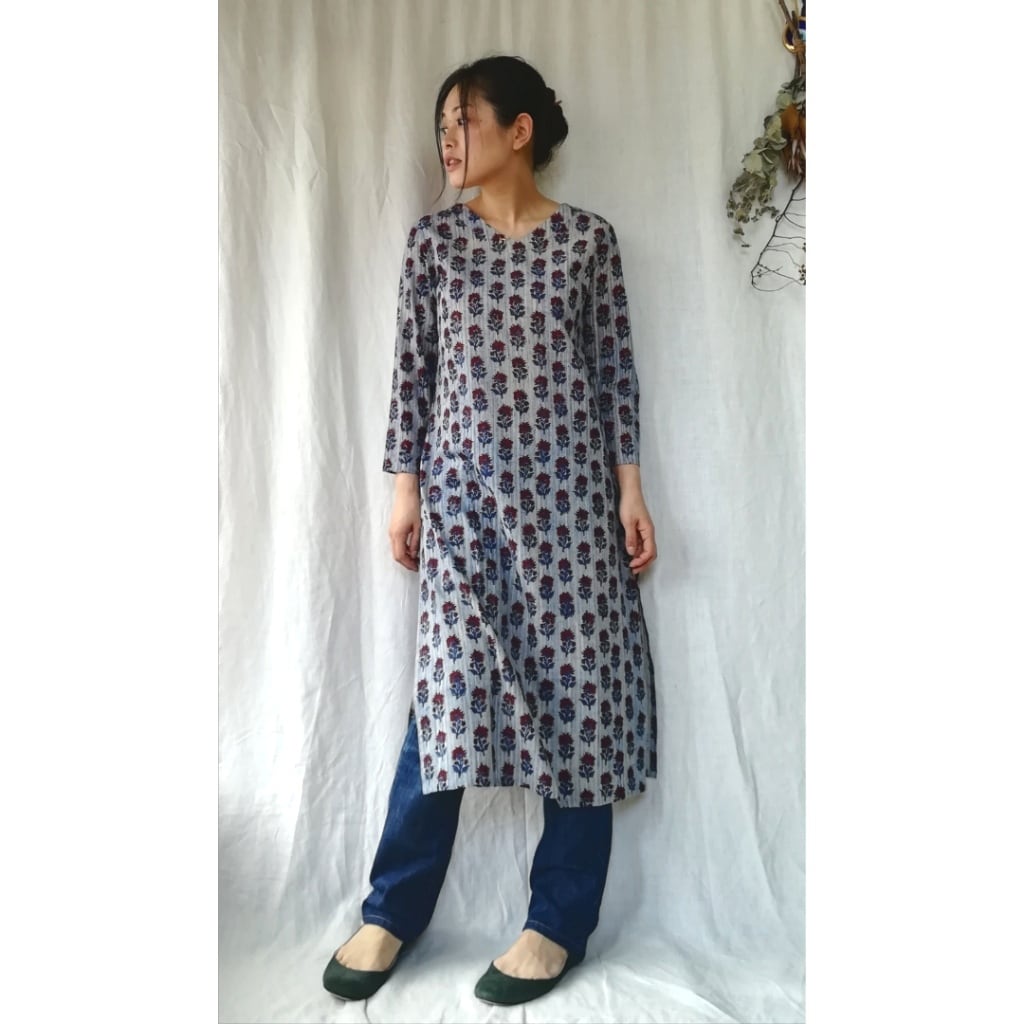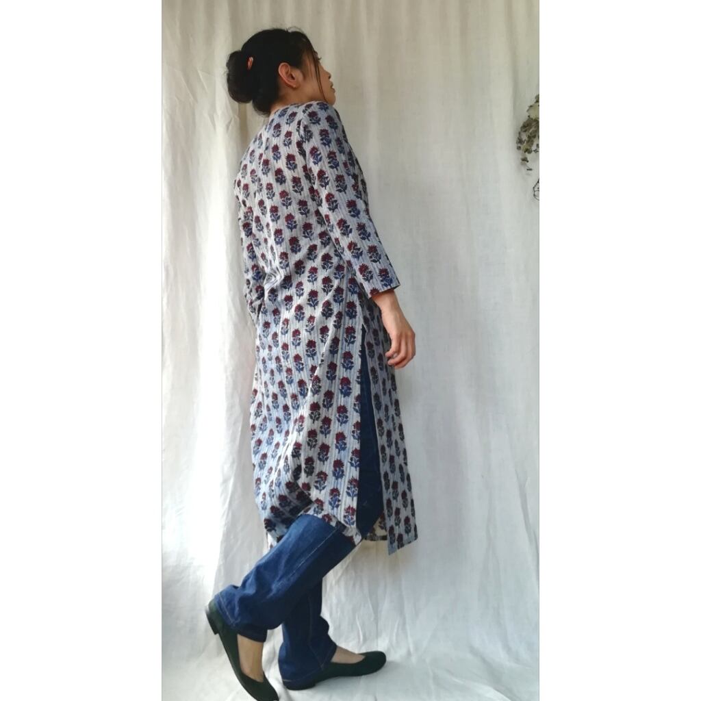 ブルー×ホワイトがベースカラーの着やすい色彩、派手すぎない真紅の花模様が可愛いクルタです。