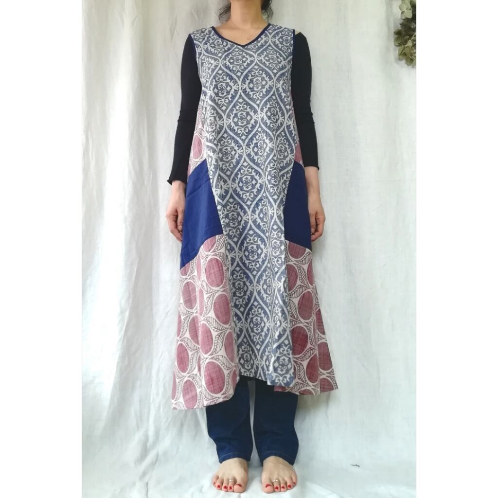 かすれた感じの着やすい色彩、浮き上がったパターン違いのオリエンタルな模様が可愛いワンピースです。