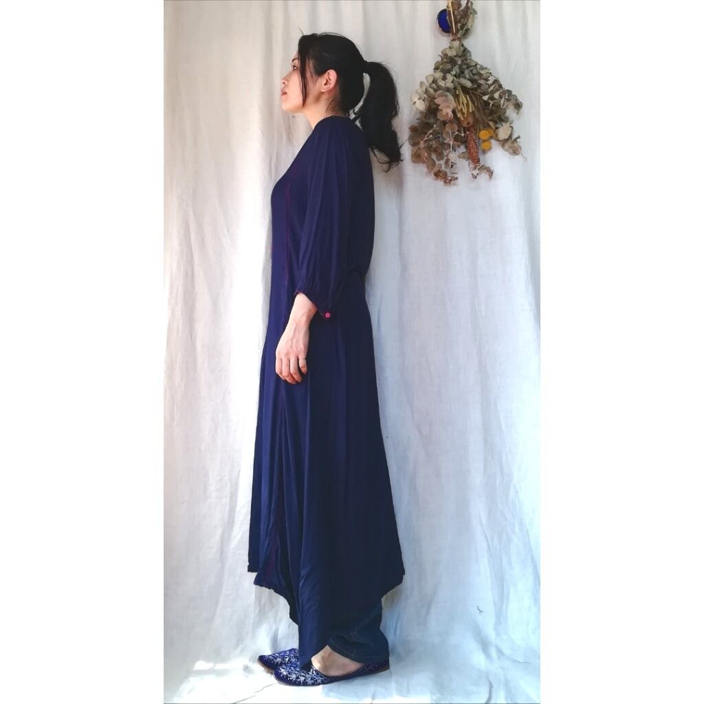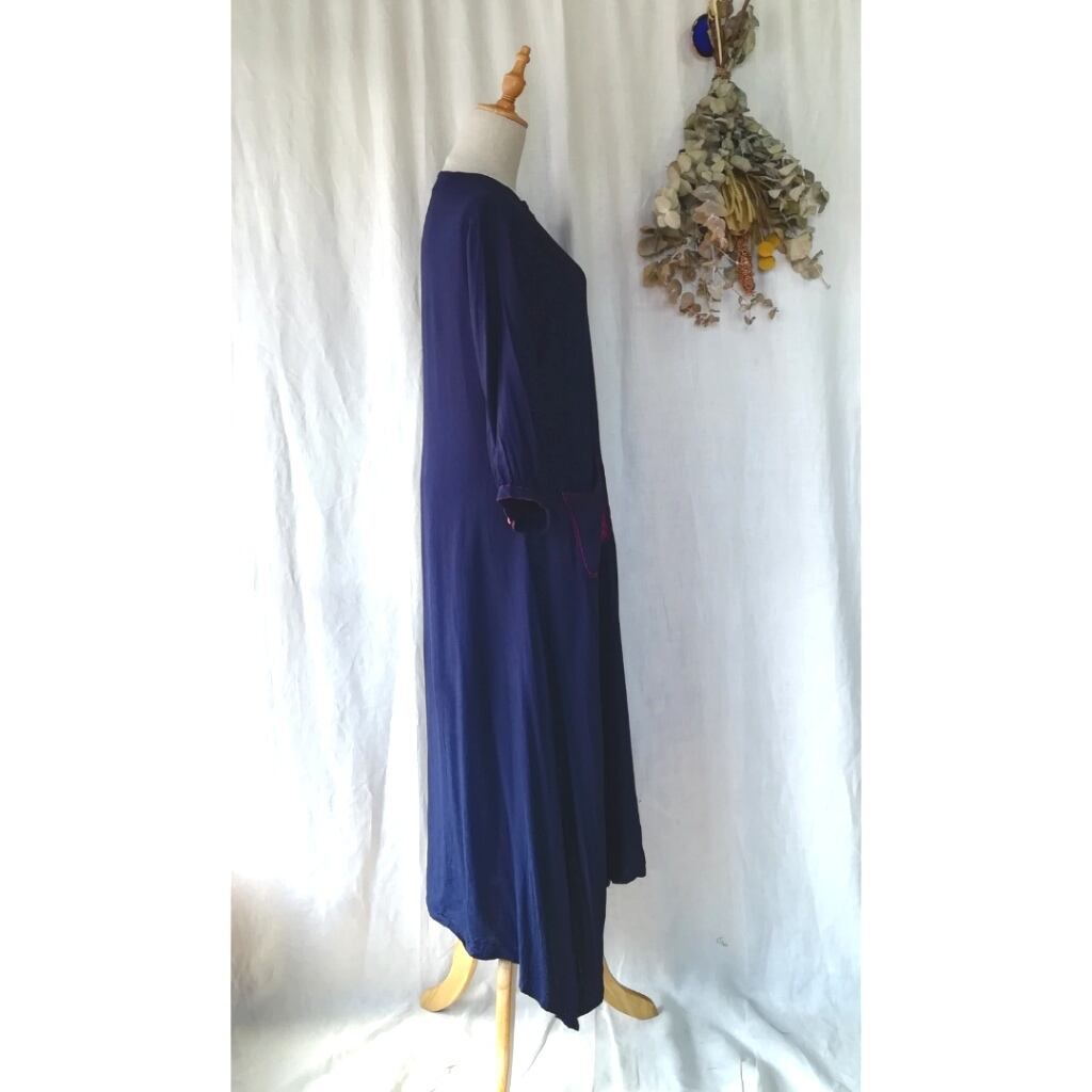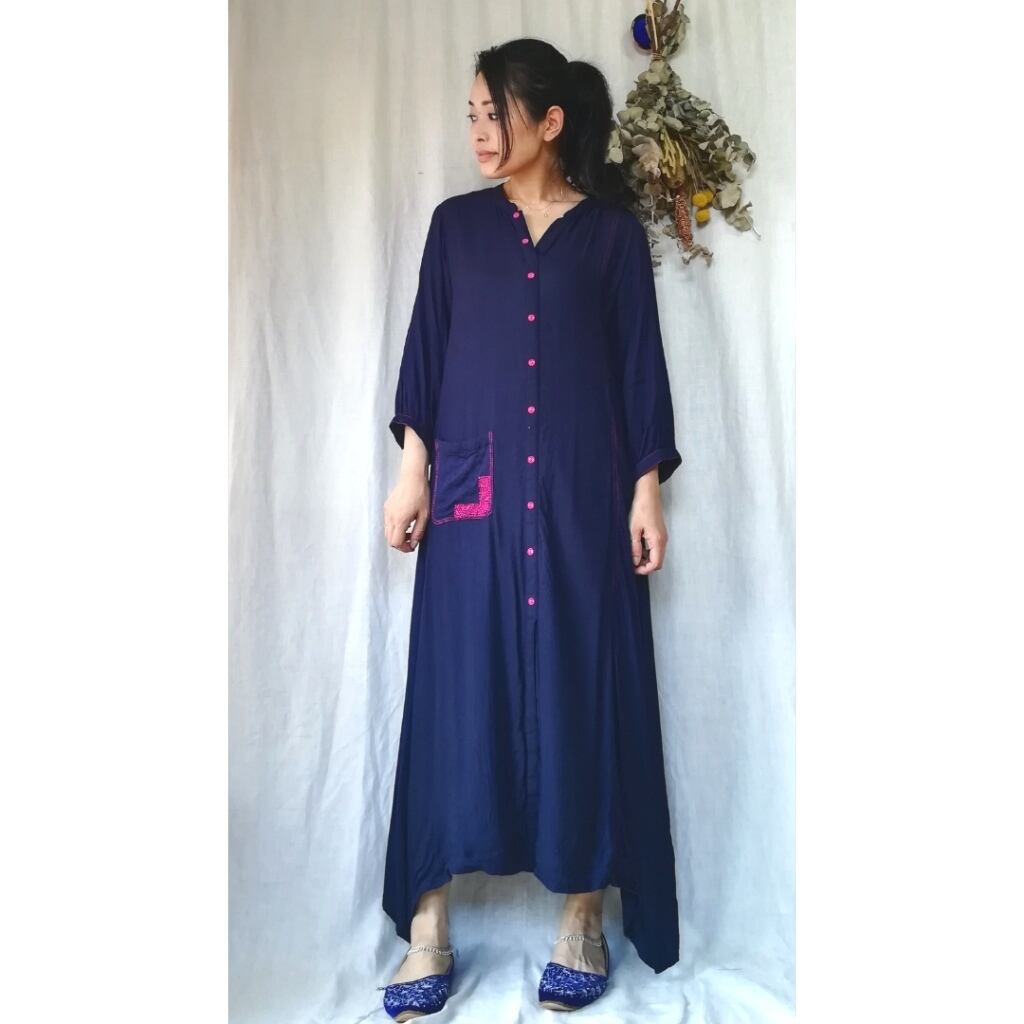 暗めの濃紺ですが艶やかな織り生地に鮮やかなマゼンタピンクのステッチ、ボタン、ポケットの刺繍などアクセントの効いたワンピース。