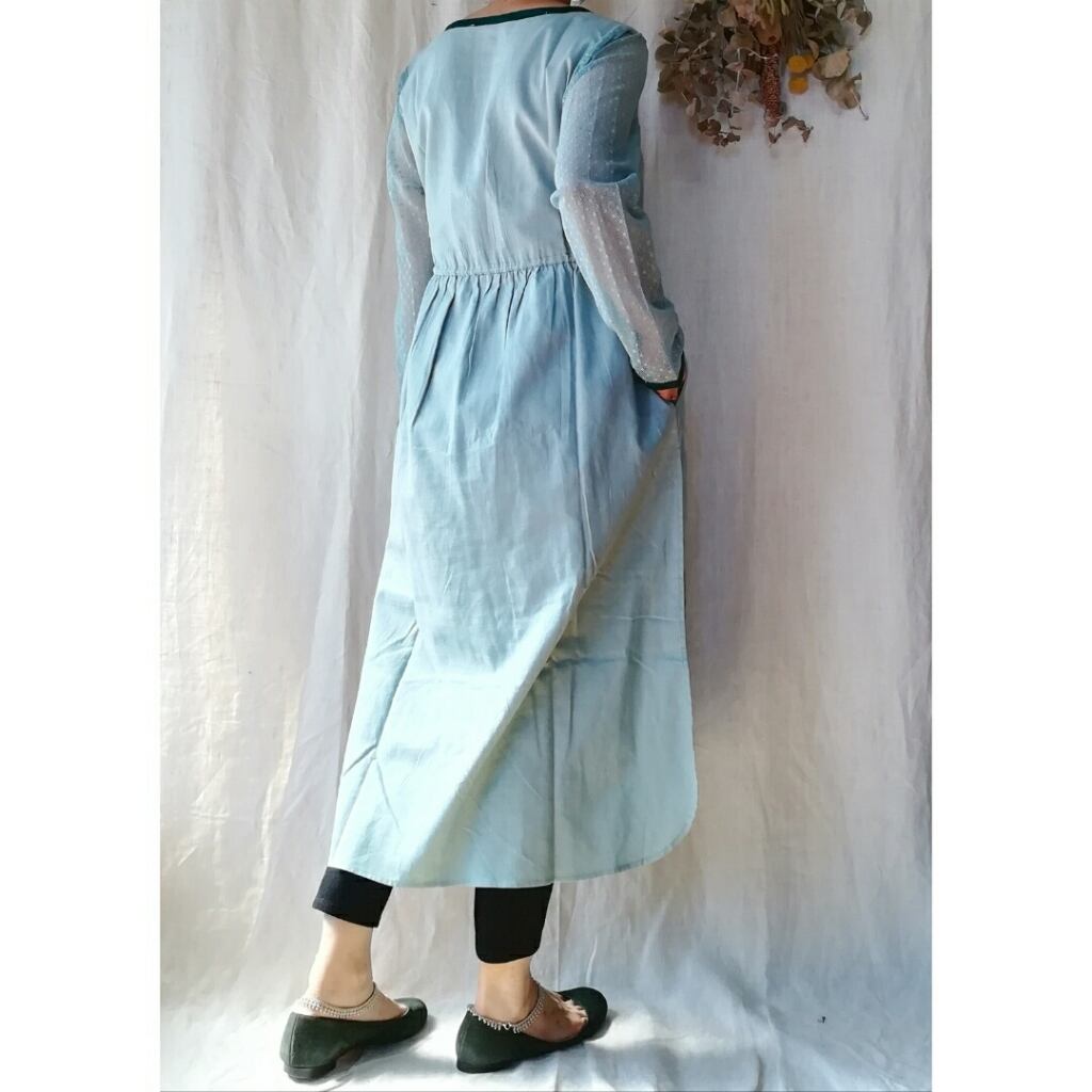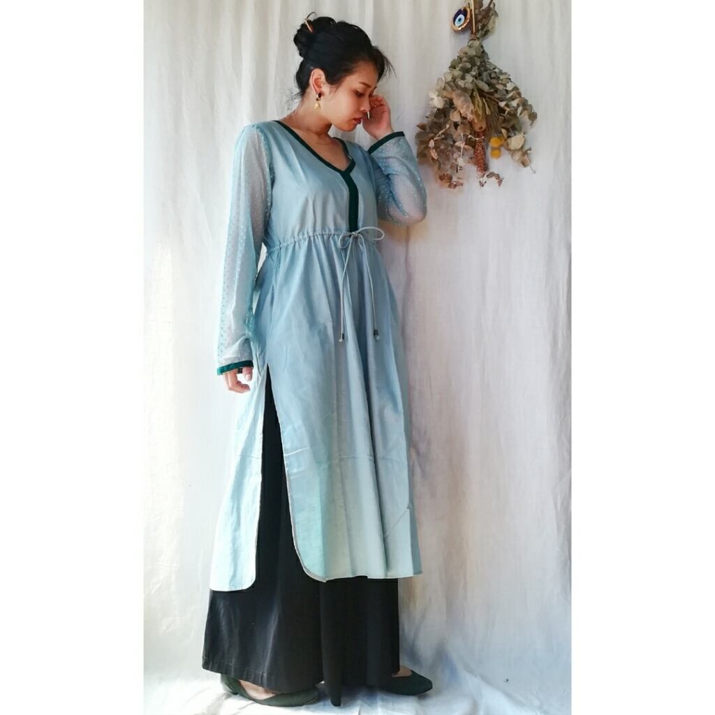 水色が混じったような薄く落ち着きのあるライトグリーンと濃い緑のバイカラーのシンプルなクルタ。