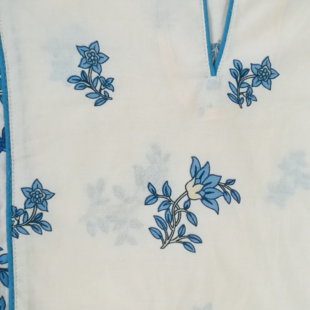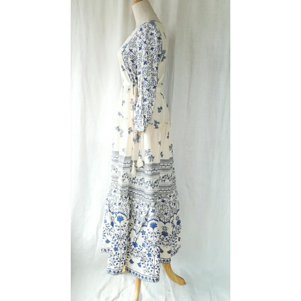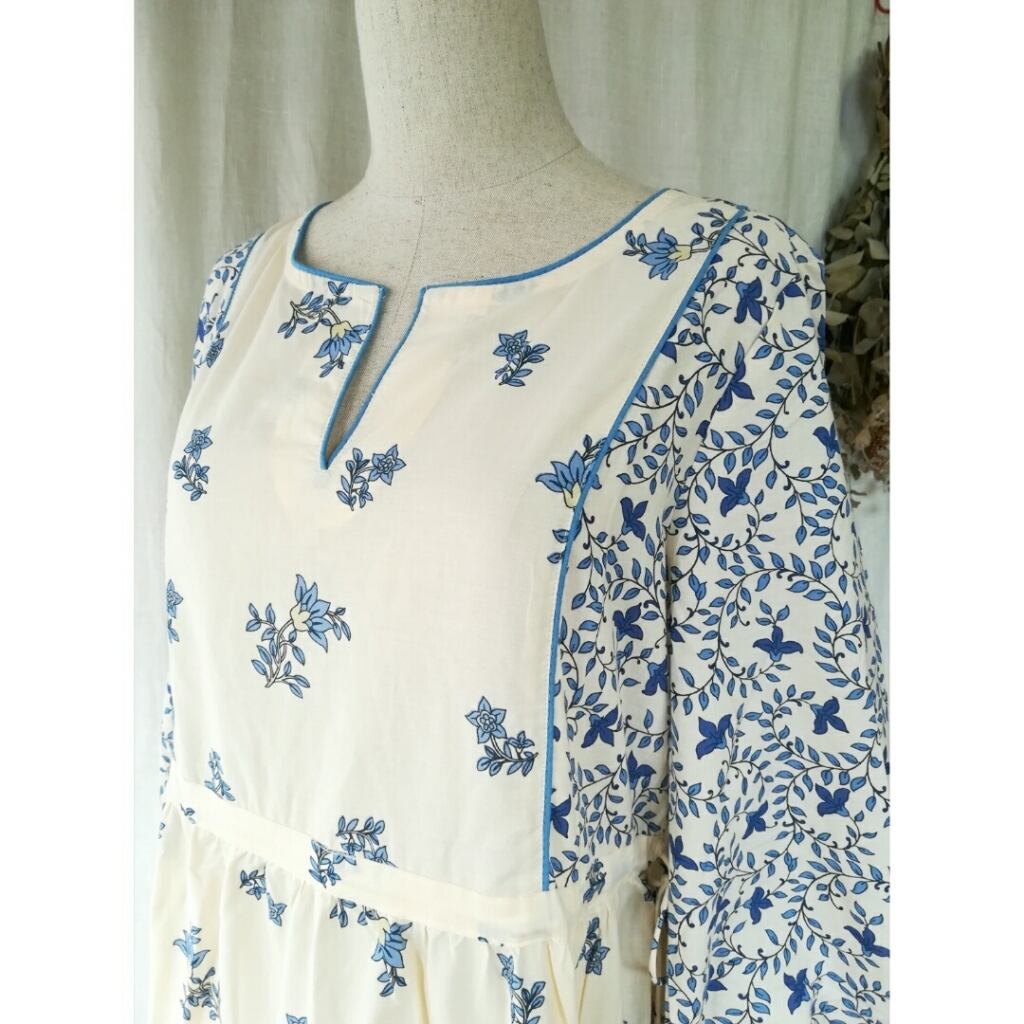 伝統技法ブロックプリント風に細部まで美しくプリントされた生地がロマンティックなワンピースです。