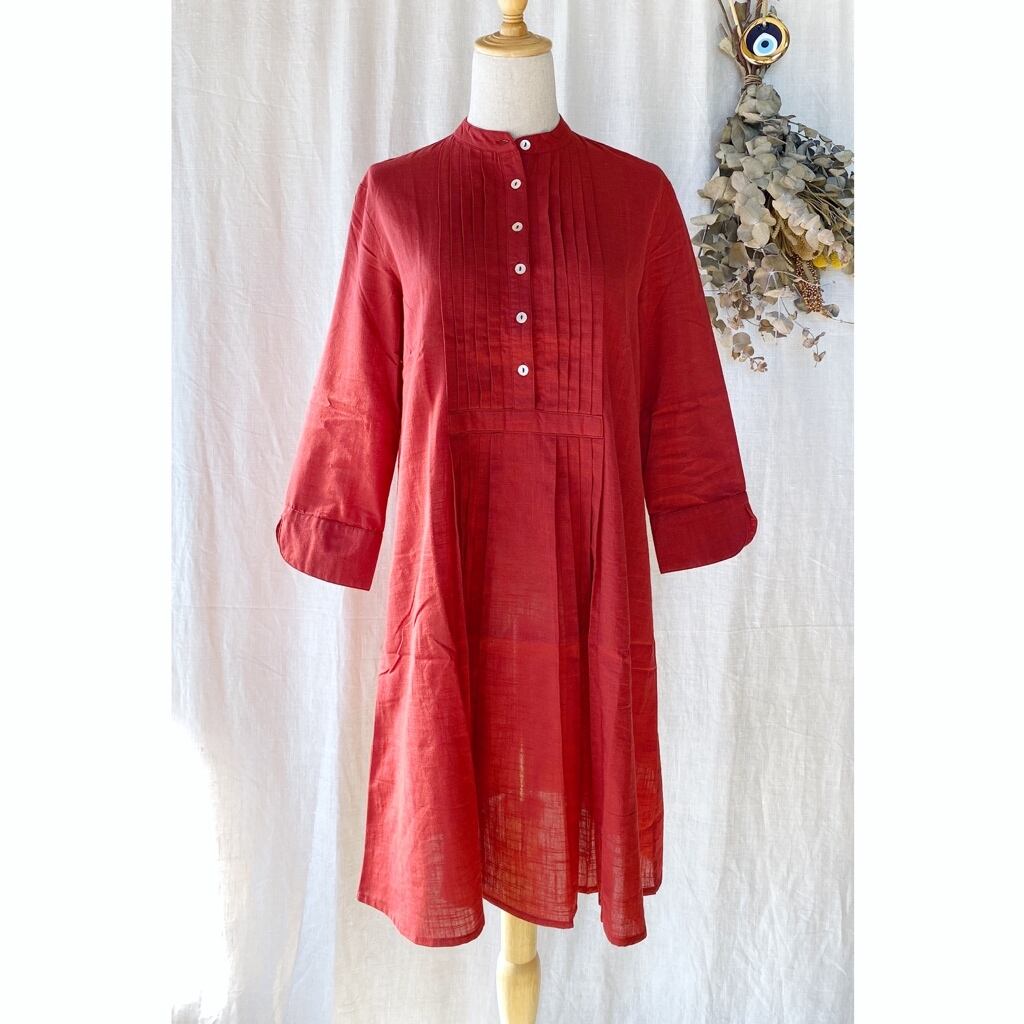 Stand collar Kruta ピンタック ミニ ワンピース チュニック クルタ RED