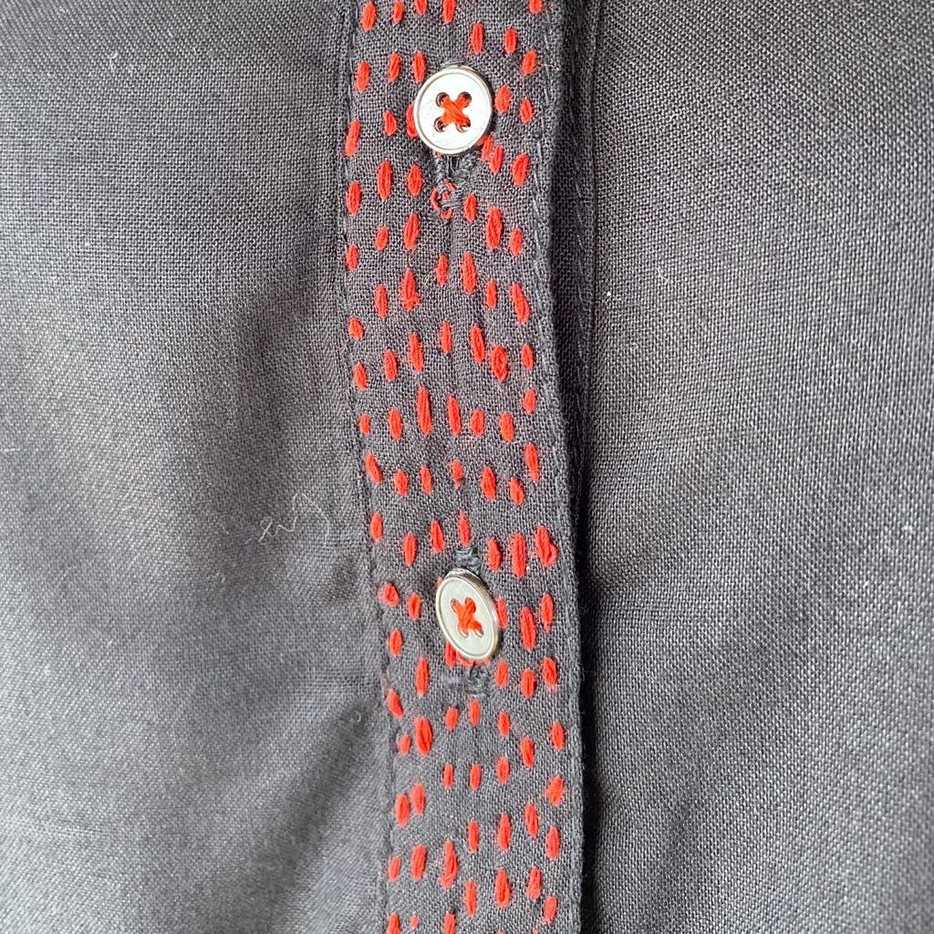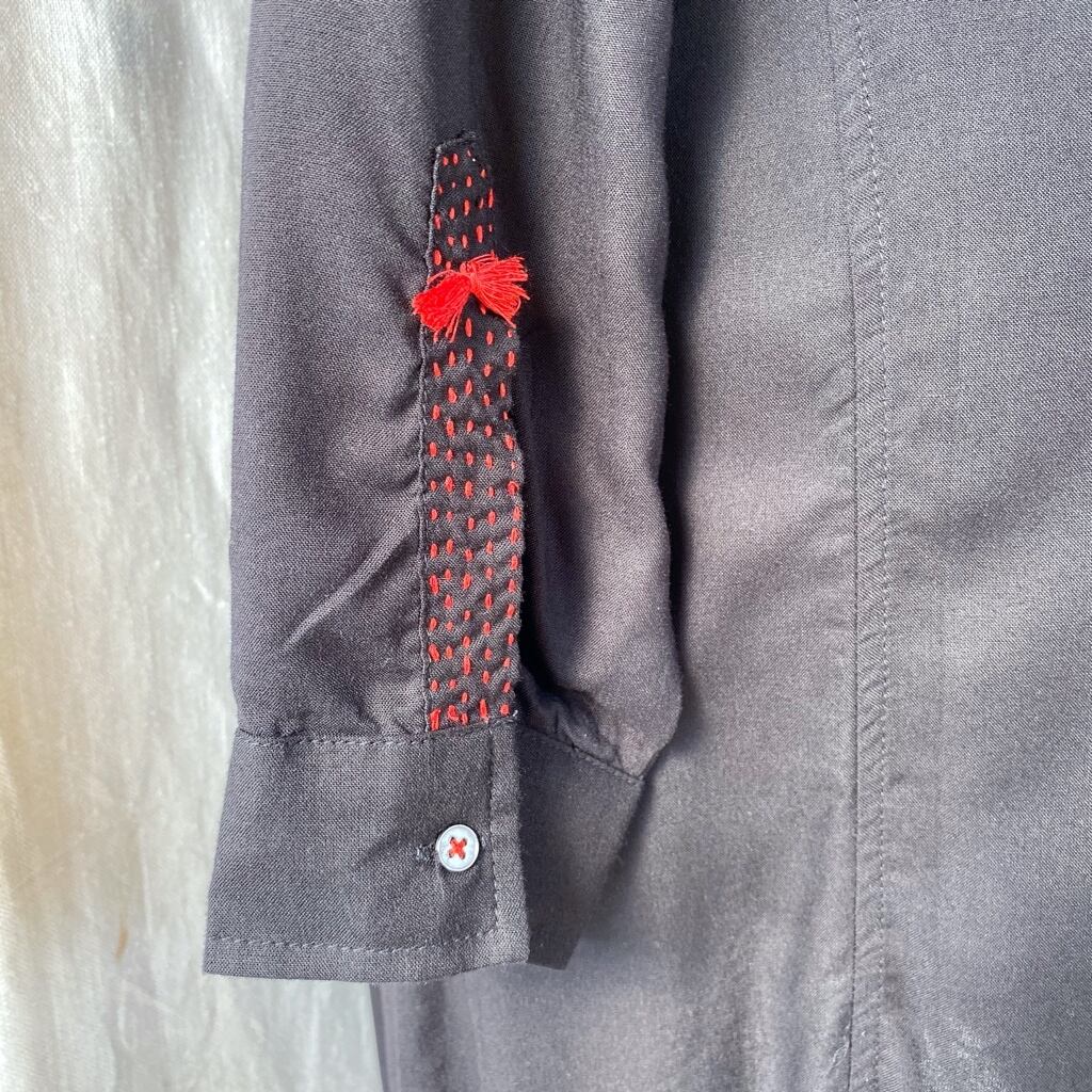 襟元前たてと袖のハンドステッチの赤い刺し子がブラックに映えて綺麗な膝丈のシンプルなワンピースタイプのクルタ。