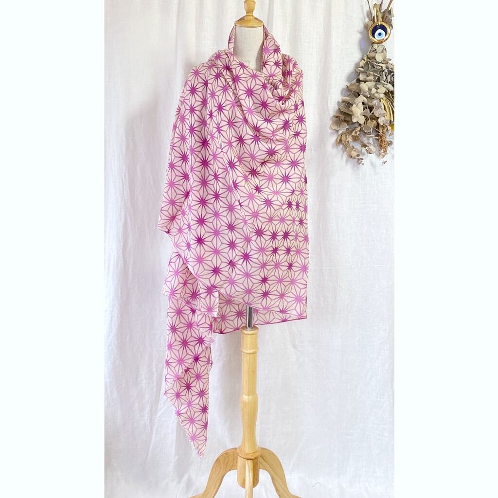 日本の伝統的な麻の葉・六角花をインドらしい鮮やかなピンクでプリントした大判ショール。
