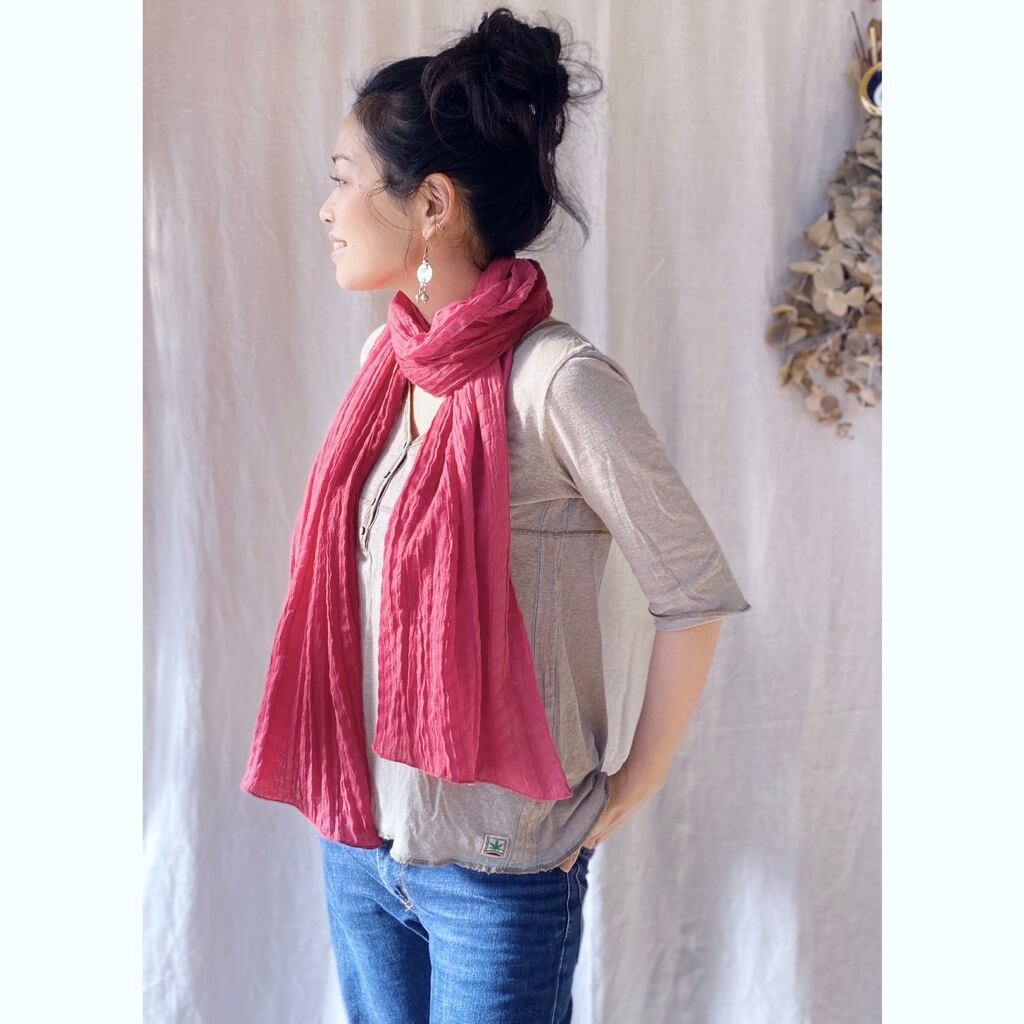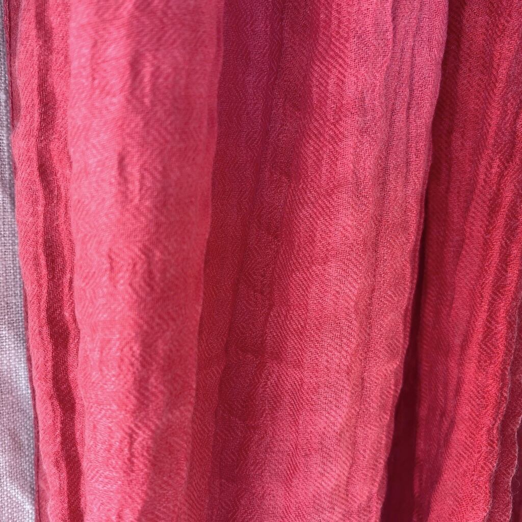 日本人に合うやや深めの真紅の赤と奇抜すぎないピンクの同系色グラデーションが美しいストール。