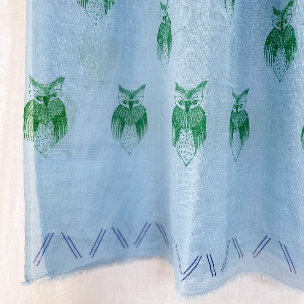 Owl pattern Printed Wool Silk Shawl Stole ふくろう プリント ウール シルク ストール ショール LIGHT BLUE×GREEN