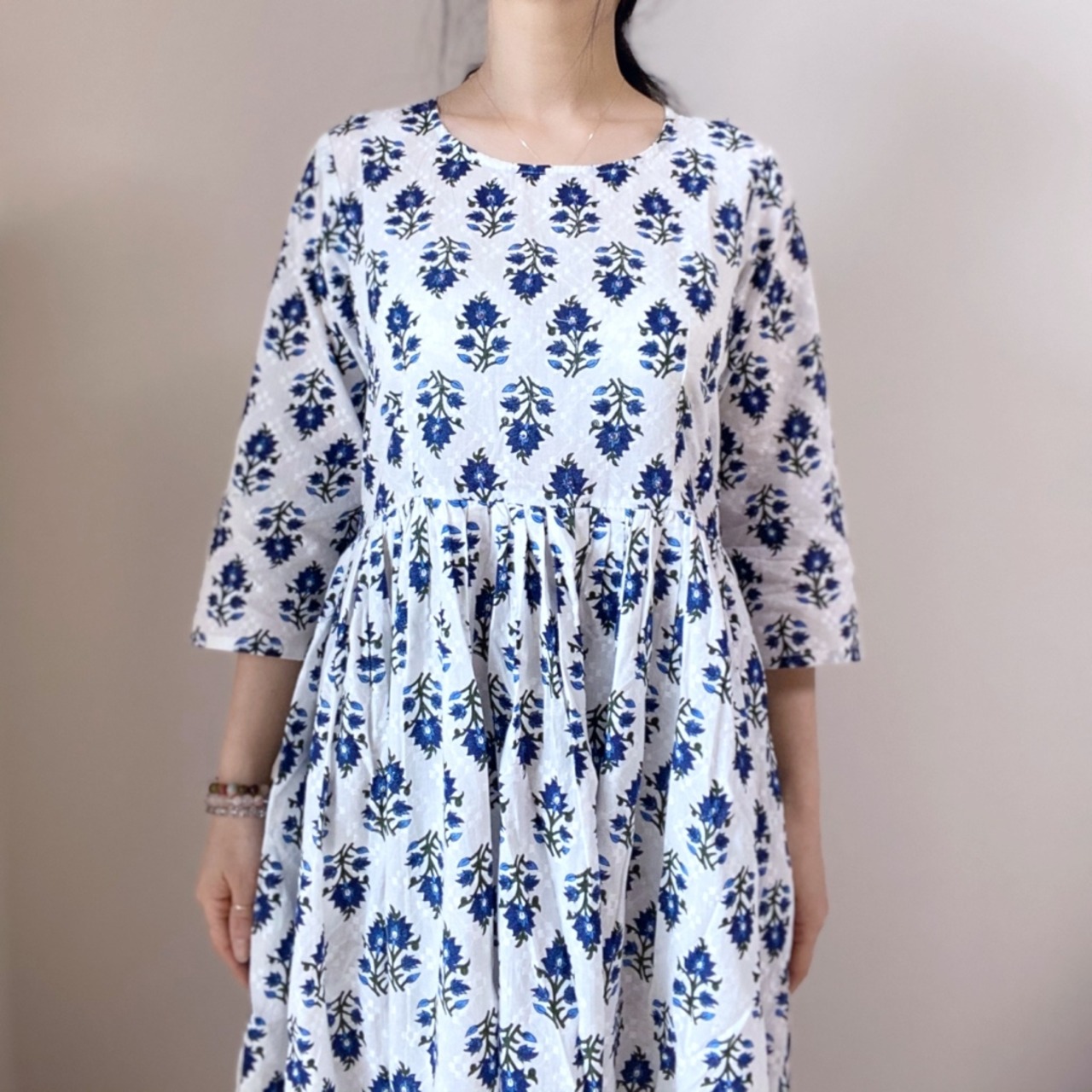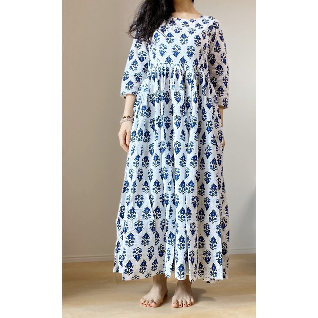 胸下からスカート部分はたっぷりギャザーのエンパイアロングワンピース。