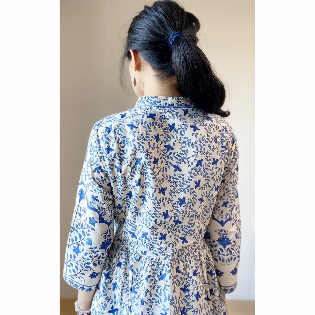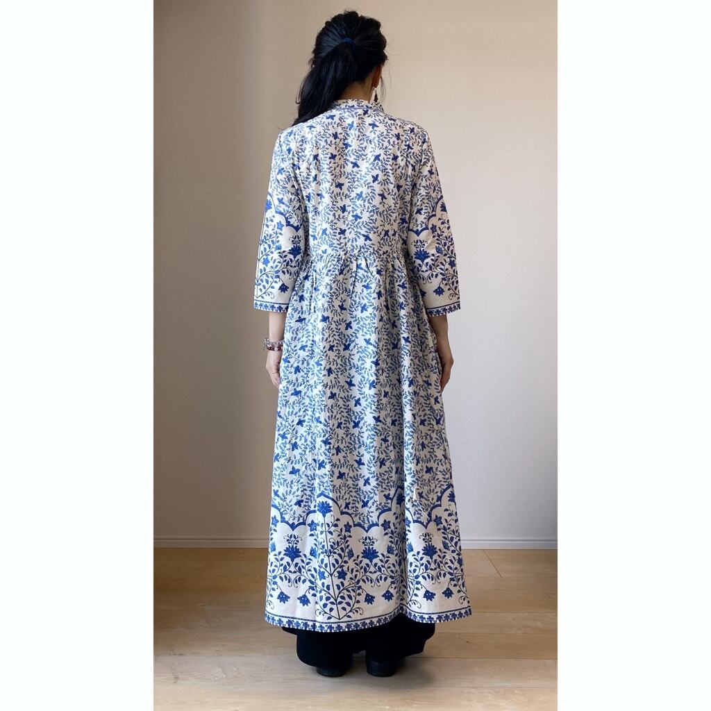 伝統技法ブロックプリント風に細部まで美しくプリントされた生地がロマンティックなワンピースです。